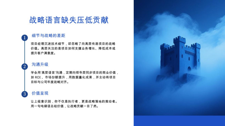 才能强的 PM 容易堕入 “时代众人” 误区,纠结于进程优化、时代卡点,却忘了跟高层说 “阵势的战术价值”—— 而这恰正是晋升陆续者的要害。
