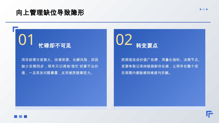 纰缪阐扬:只在迷惑问起时才说 “程度往日”,从不主动同步风险、争取资源;阵势成效了以为 “效果自会言语”,却没让迷惑知谈你解决了些许跨部门冲突、规避了些许耗损。