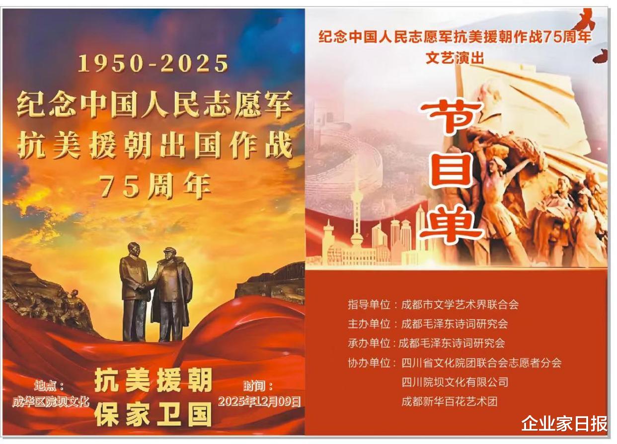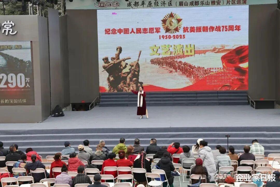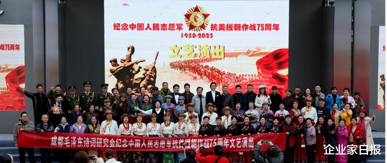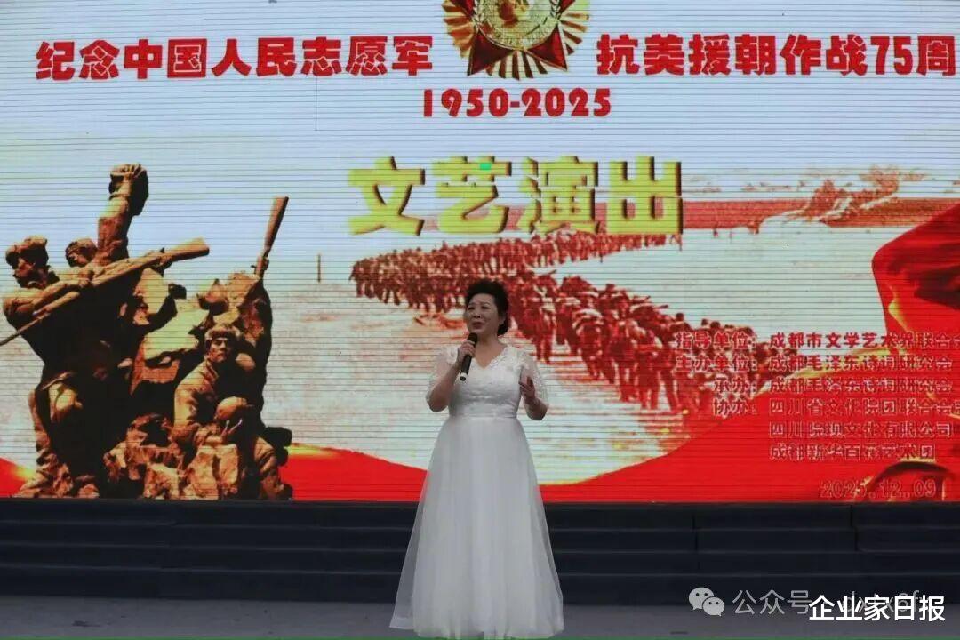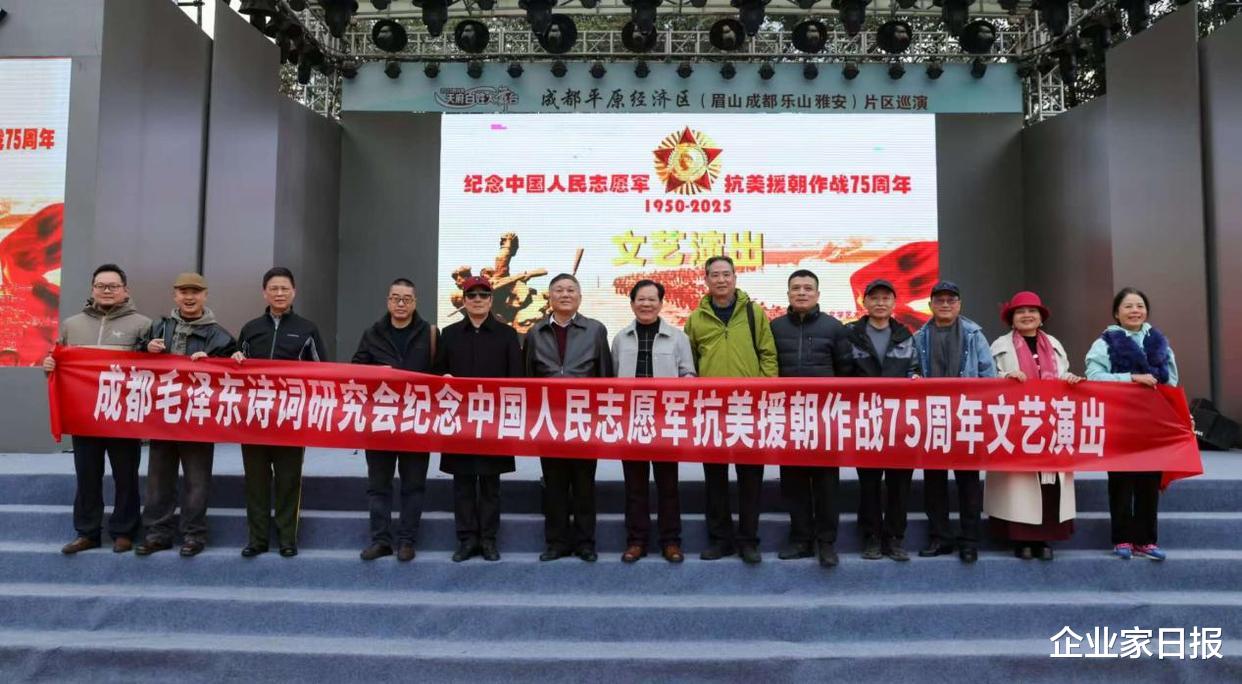 为了铭刻历史、施展伟大的爱国目的精神,进一步激勉广阔会员及市民的家国情愫,12月9日,成都毛泽东诗词商榷会主理的“纪念中国东说念主民志愿军抗好意思援朝作战75周年”文艺献技当作,在成都市中心的四川院坝文化广场广阔举行。