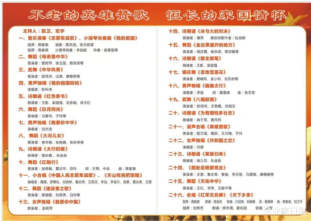 文艺节目献技中,演员们以会员们的原创诗词歌舞作品为中枢,用诗歌朗读、唱歌、跳舞、器乐演奏等文艺节目,重温了历史、陈赞了硬汉,诱导了广宽市民驻足不雅看、点赞赏玩,起到了致密的社会作用。