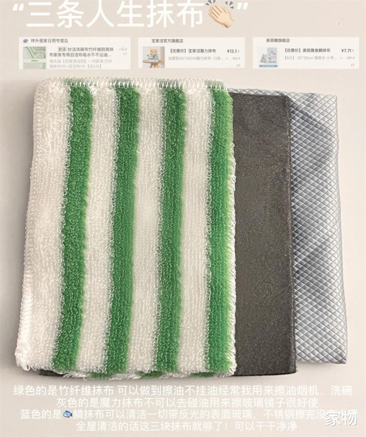 条纹棉抹布、竹纤维布和鱼鳞布,是我家厨房用得最多的三种抹布,棉布用来擦手擦水渍,吸水性强;竹纤维抹布用来清洁重油污的灶台油烟机,不易沾油,易冲洗;鱼鳞布则用来刷洗餐具,较重的油污也能快速清算干净,无敌。