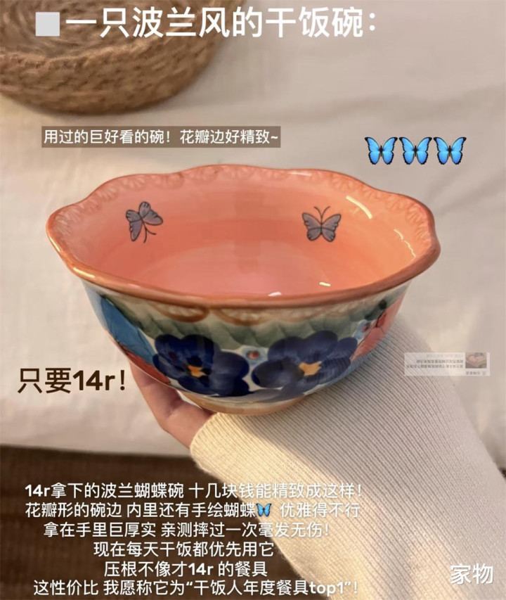 临了就是这个花朵形、蝴蝶图案的加厚陶瓷碗啦,拿得手上,就能感到其瓷质和釉面的温润感,而外面花丛、内部蝴蝶飞翔的浮松图案也果真是仙女心满满,你敢念念,这样一个瓷碗才14块,太合算了吧!