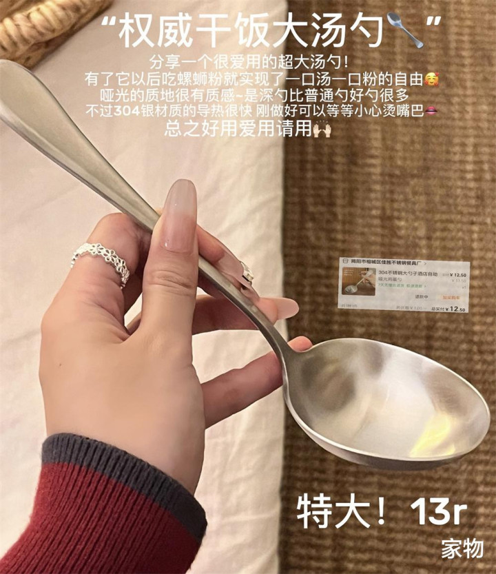 它的上风在于深度实足,或者同期舀起汤和粉(面),一口下去,别提多爽了;而304食用级不锈钢材质,也能保证卫生安全,且便捷清算,斟酌到它价钱才13块,果真挑不出什么谬误了。