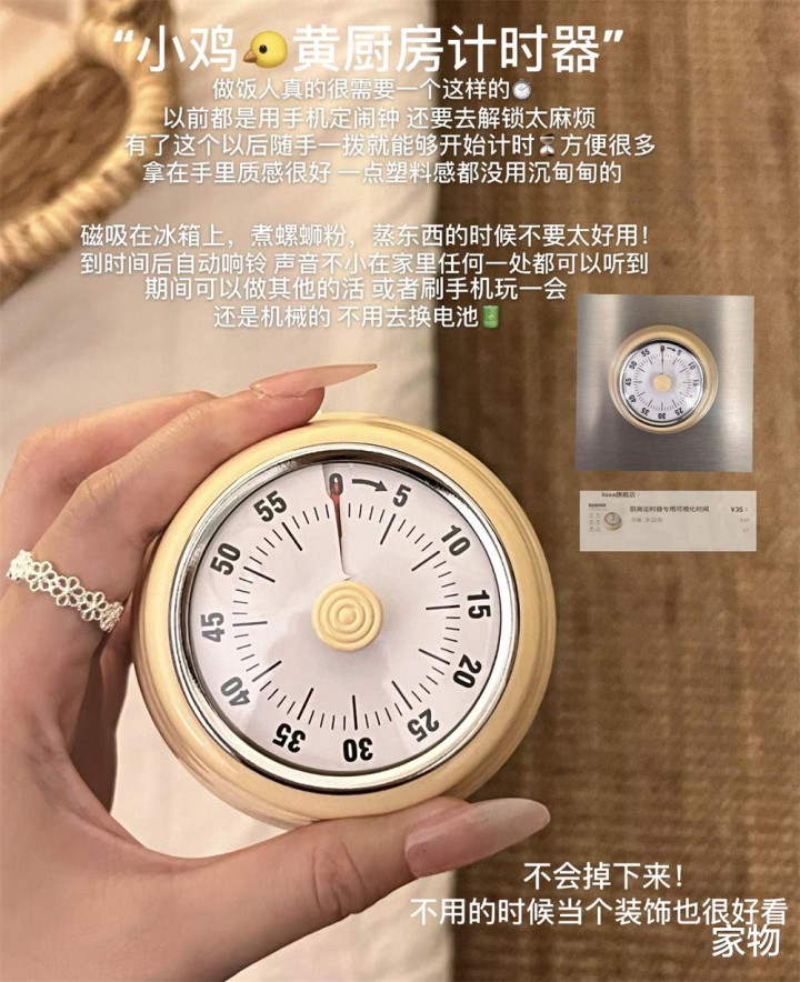 这计时器的容貌,就是那种小鸡羽毛的的容貌,浅浅的很面子,重要已经机械式的闹钟,无形中为厨房增添了几分维捏的嗅觉。