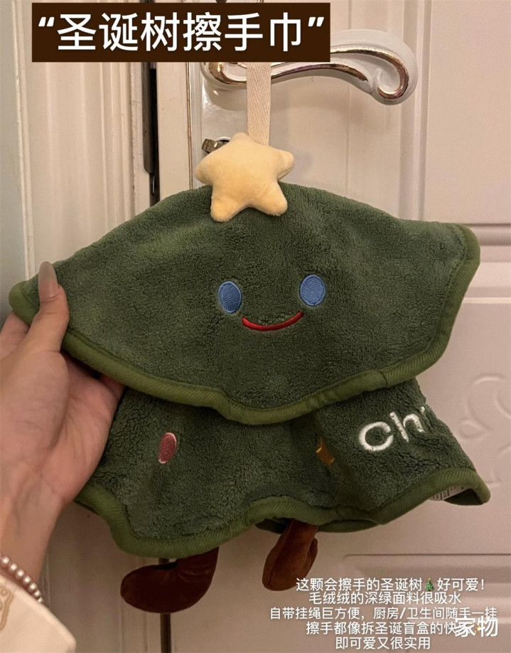 无需多言,完满是因为颜值买的,比起鄙俗的雪尼尔擦手球来说,它深绿色圣诞树的外不雅要更面子,此外,它还带一个挂绳,岂论是挂在卫生间厨房的门把手上,已经水槽旁的挂钩上,用着王人挺便捷。