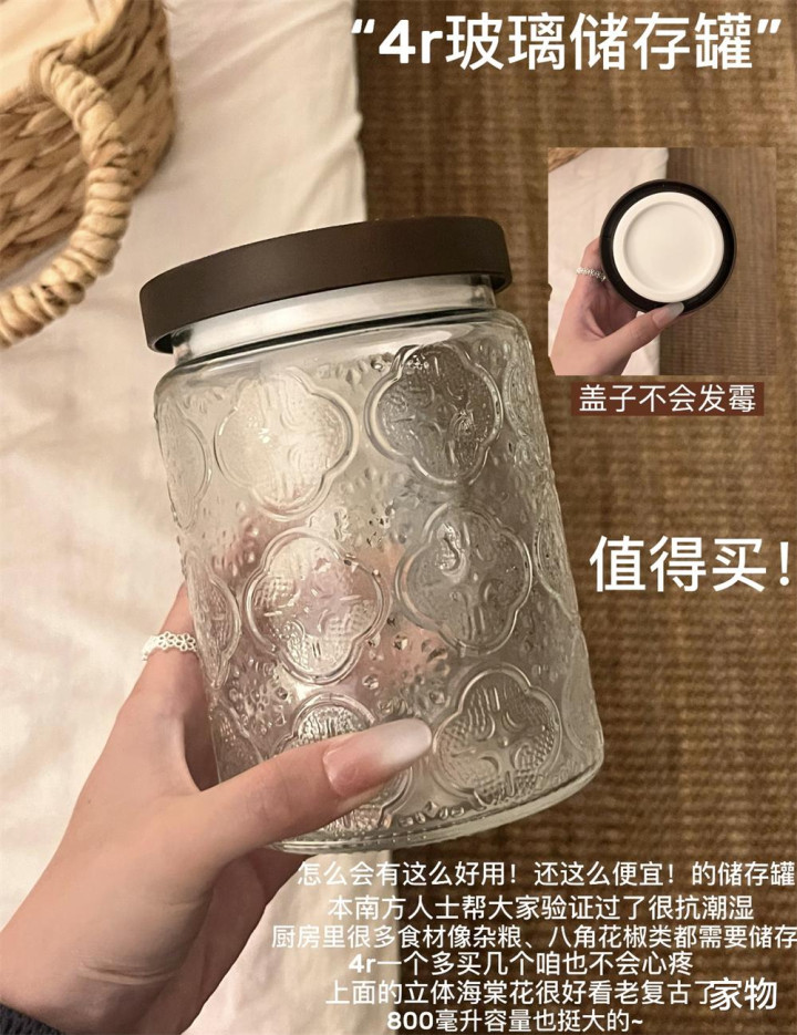 我牢记这种纹饰叫“海棠玻璃”,往日总是在家里的室内玻璃窗、柜子门扇上看到,现时竟然被东说念主作念到了密封罐上,你别说,这颜值是真高,有几分维捏的韵味。