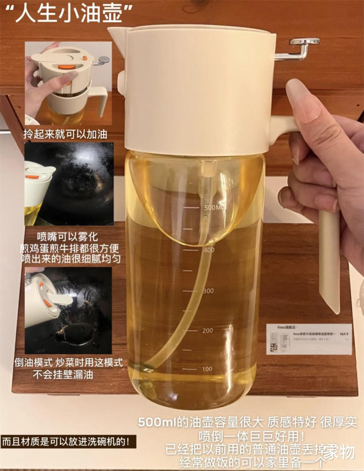 领先它喷嘴雾化极度均匀,喷洒在锅里煎鸡蛋、煎牛排王人能起到可以的控油和省油后果;其次,它还有一个倒油方法需要宽油或炸食品的时候,可以往里倾倒,便捷得很。