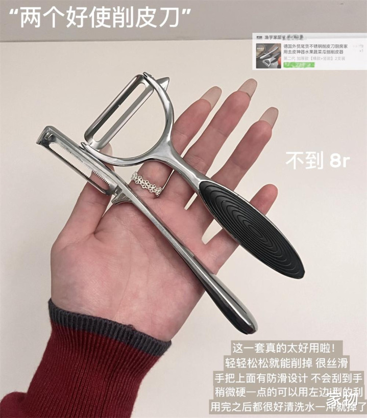 这俩削皮刀,一个是横版的,一个是竖版的,别离用来科罚生果和蔬菜,尤其土豆、茄子、黄瓜等不同表情的果蔬,机动垄断横竖版来削皮果真一本万利,用事后用水一冲也能清洗干净,值得买。